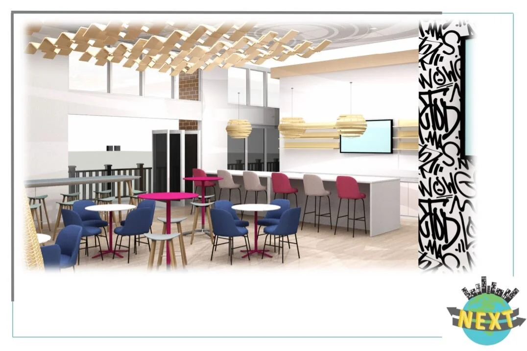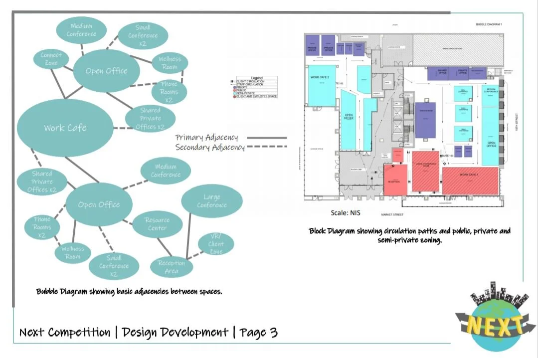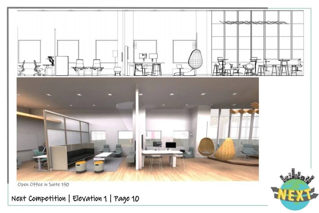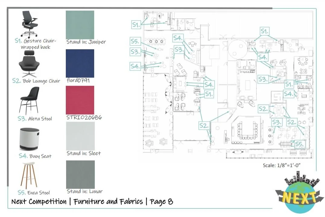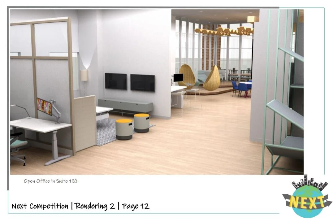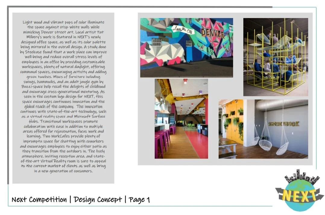 NEXT Office was a project completed the first semester of my Junior Year in the Interior Design Program. I designed this space for the Steelcase NEXT Student Design Competition. Within this competition we were given a metaphorical client and had to base our design around their wants and needs. My class focused heavily around space planning and the adjacencies that each space had to one another to maximize productivity for staff and overall flow within the office. I based my color palette around a famous Denver graffiti painting, stimulating a bright and creative atmosphere perfect for workplace innovation.